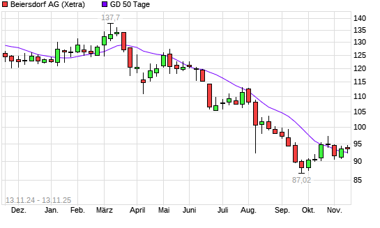 Mit dem Anstieg auf 93,28 EUR hat die Beiersdorf-Aktie am 12.11.2025 die 50-Tage-Linie nach oben gekreuzt.Die Beiersdorf-Aktie befindet sich seit dem 06.05.2025 im langfristigen Abwärtstrend ...weiterlesen