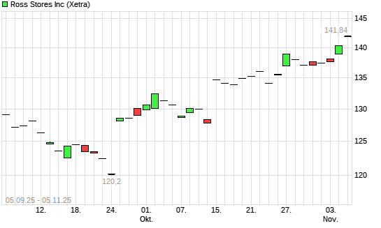 Mit dem Anstieg auf 141,08 EUR hat die Ross Stores-Aktie (ISIN US7782961038) am 05.11.2025 ein neues 6-Monats-Hoch erreicht und damit den Kurs vom 04.11.2025 eingestellt.Die Ross Stores-Aktie ...weiterlesen