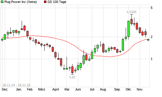 Mit dem Rücksetzer auf 1,79 EUR hat die Plug Power-Aktie am 17.11.2025 die 100-Tage-Linie nach unten gekreuzt.Die Plug Power-Aktie befindet sich seit dem 16.09.2025 im langfristigen Aufwärtstrend ...weiterlesen