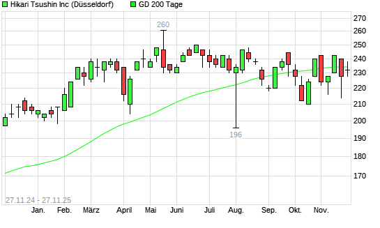 Mit dem Anstieg auf 240,00 EUR hat die Hikari Tsushin-Aktie am 26.11.2025 die 200-Tage-Linie nach oben gekreuzt.Die Hikari Tsushin-Aktie befand sich seit dem 18.11.2025 im langfristigen Abwärtstrend ...weiterlesen