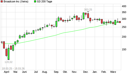 Mit dem Rücksetzer auf 276,50 EUR hat die Broadcom-Aktie am 17.03.2026 die 200-Tage-Linie nach unten gekreuzt.Die Broadcom-Aktie befand sich seit dem 05.03.2026 im ...weiterlesen