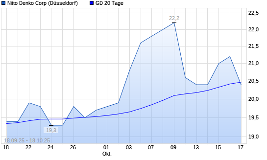 Mit dem Rücksetzer auf 20,60 EUR hat die Nitto Denko-Aktie am 17.10.2025 die 20-Tage-Linie nach unten gekreuzt.Die Nitto Denko-Aktie befindet sich seit dem 11.07.2025 im langfristigen Aufwärtstrend ...weiterlesen