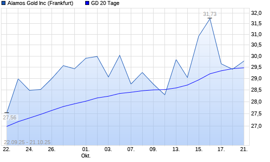 Mit dem Rücksetzer auf 29,41 EUR hat die Alamos Gold-Aktie am 20.10.2025 die 20-Tage-Linie nach unten gekreuzt.Die Alamos Gold-Aktie befindet sich seit dem 05.08.2025 im langfristigen Aufwärtstrend ...weiterlesen