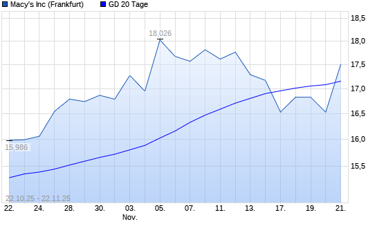 Mit dem Anstieg auf 17,51 EUR hat die Macy's-Aktie am 21.11.2025 die 20-Tage-Linie nach oben gekreuzt.Die Macy's-Aktie befindet sich seit dem 03.09.2025 im langfristigen Aufwärtstrend und hat ...weiterlesen