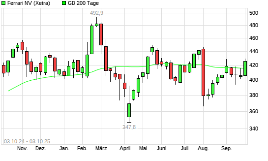 Mit dem Anstieg auf 426,00 EUR hat die Ferrari-Aktie am 02.10.2025 die 200-Tage-Linie nach oben gekreuzt.Die Ferrari-Aktie befand sich seit dem 08.09.2025 im langfristigen Abwärtstrend und hat ...weiterlesen