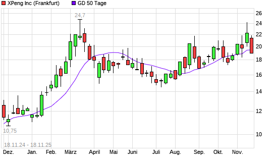 Mit dem Rücksetzer auf 19,25 EUR hat die XPeng-Aktie am 17.11.2025 die 50-Tage-Linie nach unten gekreuzt.Die XPeng-Aktie befindet sich seit dem 04.08.2025 im langfristigen Aufwärtstrend ...weiterlesen