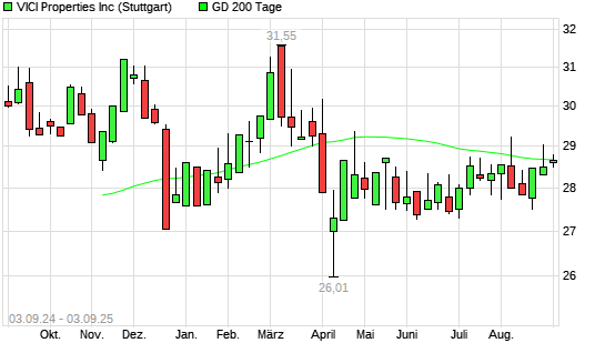 Mit dem Rücksetzer auf 28,62 EUR hat die VICI Properties-Aktie am 02.09.2025 die 200-Tage-Linie nach unten gekreuzt.Die VICI Properties-Aktie befand sich seit dem 28.08.2025 im langfristigen ...weiterlesen