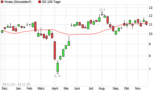 Mit dem Rücksetzer auf 11,00 EUR hat die Hirata-Aktie am 18.11.2025 die 100-Tage-Linie nach unten gekreuzt.Die Hirata-Aktie befindet sich seit dem 15.10.2025 im langfristigen Aufwärtstrend ...weiterlesen