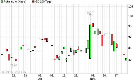 Mit dem Rücksetzer auf 79,91 EUR hat die Roku-Aktie am 21.11.2025 die 100-Tage-Linie nach unten gekreuzt.Die Roku-Aktie befindet sich seit dem 11.08.2025 im langfristigen Aufwärtstrend ...weiterlesen