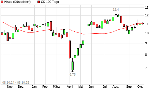 Mit dem Rücksetzer auf 11,00 EUR hat die Hirata-Aktie am 07.10.2025 die 100-Tage-Linie nach unten gekreuzt.Die Hirata-Aktie befindet sich seit dem 02.10.2025 im langfristigen Aufwärtstrend ...weiterlesen
