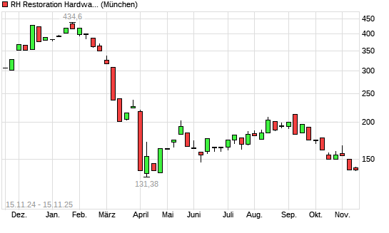 Mit dem Rücksetzer auf 130,80 EUR hat die RH-Aktie (ISIN US74967X1037) am 14.11.2025 ein neues 6-Monats-Tief erreicht und damit den Kurs vom 11.11.2025 eingestellt.Der Abstand zur 200-Tage-Linie ...weiterlesen