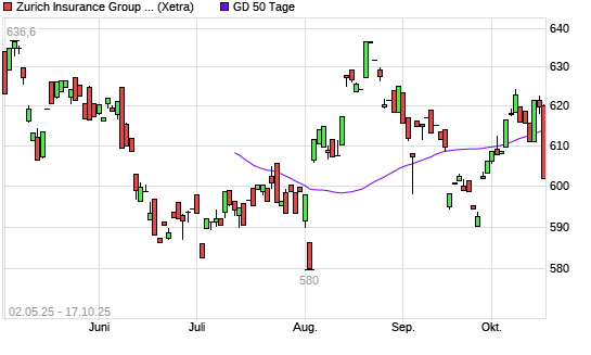Mit dem Rücksetzer auf 613,20 EUR hat die Zurich Insurance Group-Aktie am 16.10.2025 die 50-Tage-Linie nach unten gekreuzt.Die Zurich Insurance Group-Aktie befindet sich seit dem 06.10.2025 ...weiterlesen
