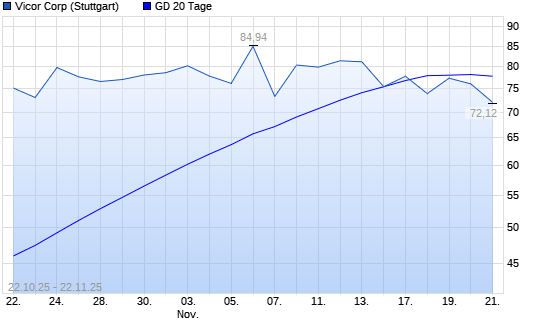Mit dem Rücksetzer auf 70,72 EUR hat die Vicor-Aktie am 21.11.2025 die 20-Tage-Linie nach unten gekreuzt.Die Vicor-Aktie befindet sich seit dem 14.10.2025 im langfristigen Aufwärtstrend ...weiterlesen