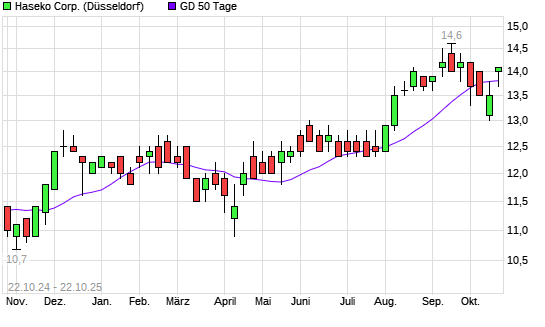 Mit dem Rücksetzer auf 13,90 EUR hat die Haseko-Aktie am 21.10.2025 die 50-Tage-Linie nach unten gekreuzt.Die Haseko-Aktie befindet sich seit dem 14.04.2025 im langfristigen Aufwärtstrend ...weiterlesen