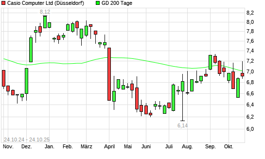 Mit dem Rücksetzer auf 6,97 EUR hat die Casio Computer-Aktie am 23.10.2025 die 200-Tage-Linie nach unten gekreuzt.Die Casio Computer-Aktie befand sich seit dem 21.10.2025 im langfristigen ...weiterlesen