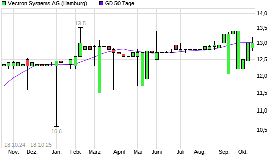 Mit dem Rücksetzer auf 13,00 EUR hat die Vectron Systems-Aktie am 17.10.2025 die 50-Tage-Linie nach unten gekreuzt.Die Vectron Systems-Aktie befindet sich seit dem 15.10.2025 im langfristigen ...weiterlesen