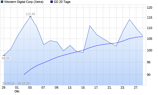 Mit dem Rücksetzer auf 105,00 EUR hat die Western Digital-Aktie am 28.10.2025 die 20-Tage-Linie nach unten gekreuzt.Die Western Digital-Aktie befindet sich seit dem 20.05.2025 im langfristigen ...weiterlesen