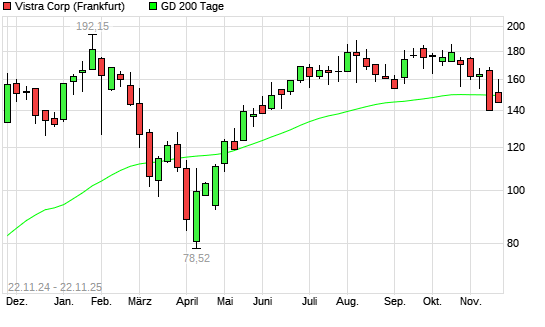 Mit dem Rücksetzer auf 144,95 EUR hat die Vistra Energy-Aktie am 21.11.2025 die 200-Tage-Linie nach unten gekreuzt.Die Vistra Energy-Aktie befand sich seit dem 19.11.2025 im langfristigen ...weiterlesen