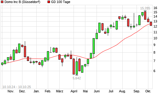Mit dem Rücksetzer auf 12,55 EUR hat die Domo-Aktie am 09.10.2025 die 100-Tage-Linie nach unten gekreuzt.Die Domo-Aktie befindet sich seit dem 09.05.2025 im langfristigen Aufwärtstrend ...weiterlesen