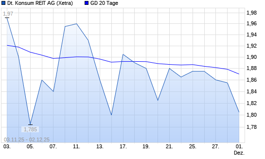 Mit dem Rücksetzer auf 1,76 EUR hat die Deutsche Konsum REIT-Aktie am 01.12.2025 die 20-Tage-Linie nach unten gekreuzt.Die Deutsche Konsum REIT-Aktie befindet sich seit dem 17.02.2025 im ...weiterlesen