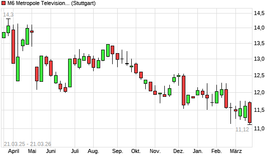 Mit dem Rücksetzer auf 11,16 EUR hat die M6 Metropole Television-Aktie (ISIN FR0000053225) am 20.03.2026 ein neues 12-Monats-Tief erreicht und damit den Kurs vom ...weiterlesen