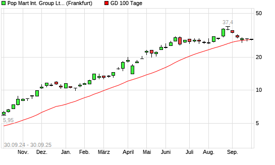 Mit dem Rücksetzer auf 28,60 EUR hat die Pop Mart International-Aktie am 29.09.2025 die 100-Tage-Linie nach unten gekreuzt.Der Abstand zur 200-Tage-Linie beträgt aktuell +31,21%.
