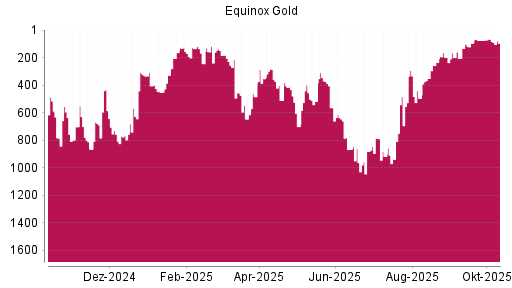 Equinox Gold ist Teil des 1690 Titel umfassenden Anlageuniversum der boerse.de-Signale Aktien Welt. In der großen Trendauswertung vom 10.10.2025 ist der Titel von Rang 96 auf Rang 76 aufgestiegen.Gesteuert ...weiterlesen