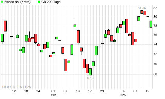 Mit dem Rücksetzer auf 76,50 EUR hat die Elastic-Aktie am 14.11.2025 die 200-Tage-Linie nach unten gekreuzt.Die Elastic-Aktie befand sich seit dem 11.11.2025 im langfristigen Aufwärtstrend ...weiterlesen