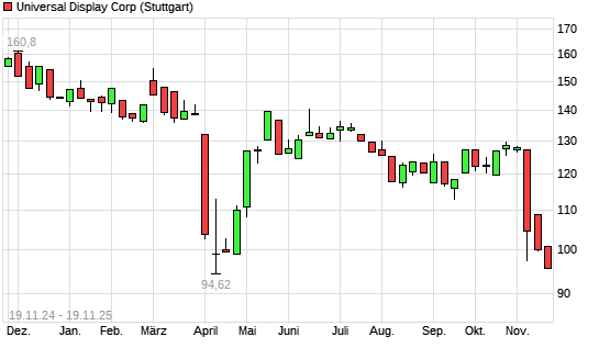Mit dem Rücksetzer auf 96,30 EUR hat die Universal Display-Aktie (ISIN US91347P1057) am 18.11.2025 ein neues 6-Monats-Tief erreicht und damit den Kurs vom 14.11.2025 eingestellt.Die Universal ...weiterlesen