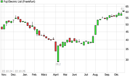 Mit dem Anstieg auf 61,00 EUR hat die Fuji Electric-Aktie (ISIN JP3820000002) am 21.10.2025 ein neues 12-Monats-Hoch erreicht und damit den Kurs vom 20.10.2025 eingestellt.Die Fuji Electric-Aktie ...weiterlesen