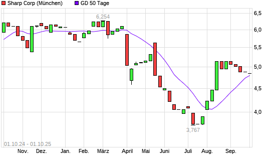 Mit dem Rücksetzer auf 4,55 EUR hat die Sharp-Aktie am 30.09.2025 die 50-Tage-Linie nach unten gekreuzt.Die Sharp-Aktie befindet sich seit dem 01.04.2025 im langfristigen Abwärtstrend und ...weiterlesen