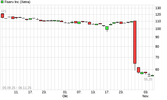 Mit dem Rücksetzer auf 55,89 EUR hat die Fiserv-Aktie (ISIN US3377381088) am 05.11.2025 ein neues 5-Jahres-Tief erreicht und damit den Kurs vom 04.11.2025 eingestellt.Die Fiserv-Aktie befindet ...weiterlesen