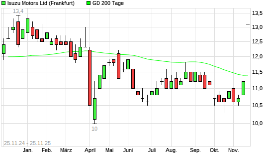Mit dem Anstieg auf 13,10 EUR hat die Isuzu Motors-Aktie am 24.11.2025 die 200-Tage-Linie nach oben gekreuzt.Die Isuzu Motors-Aktie befand sich seit dem 14.05.2025 im langfristigen Abwärtstrend ...weiterlesen