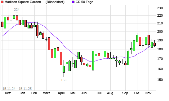 Mit dem Rücksetzer auf 185,00 EUR hat die Madison Square Garden Sports A-Aktie am 14.11.2025 die 50-Tage-Linie nach unten gekreuzt.Die Madison Square Garden Sports A-Aktie befindet sich ...weiterlesen
