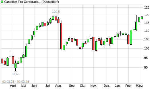Mit dem Anstieg auf 120,00 EUR hat die Canadian Tire-Aktie (ISIN CA1366812024) am 02.03.2026 ein neues 6-Monats-Hoch erreicht und damit den Kurs vom 27.02.2026 eingestellt.Die ...weiterlesen