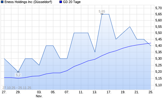 Mit dem Anstieg auf 5,50 EUR hat die Eneos-Aktie am 24.11.2025 die 20-Tage-Linie nach oben gekreuzt.Die Eneos-Aktie befindet sich seit dem 06.08.2025 im langfristigen Aufwärtstrend und hat in ...weiterlesen