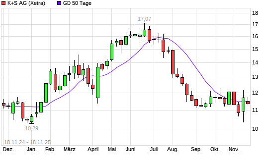 Mit dem Rücksetzer auf 11,30 EUR hat die K+S-Aktie am 17.11.2025 die 50-Tage-Linie nach unten gekreuzt.Die K+S-Aktie befindet sich seit dem 06.08.2025 im langfristigen Abwärtstrend und ...weiterlesen