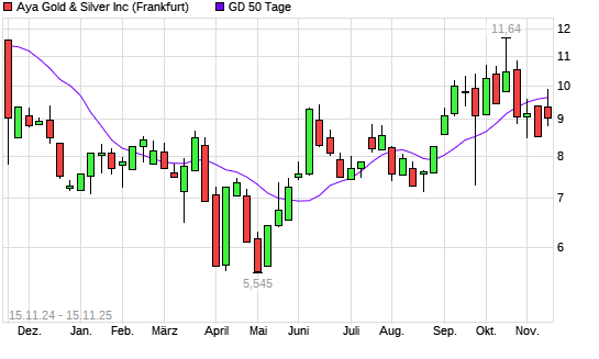 Mit dem Rücksetzer auf 9,03 EUR hat die Aya Gold & Silver-Aktie am 14.11.2025 die 50-Tage-Linie nach unten gekreuzt.Die Aya Gold & Silver-Aktie befindet sich seit dem 26.09.2025 im ...weiterlesen