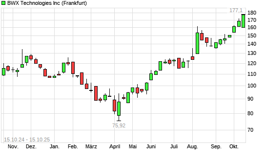 Mit dem Anstieg auf 177,10 EUR hat die BWX Technologies-Aktie (ISIN US05605H1005) am 14.10.2025 ein neues All-Time-High erreicht und damit den Kurs vom 09.10.2025 eingestellt.Die BWX Technologies-Aktie ...weiterlesen