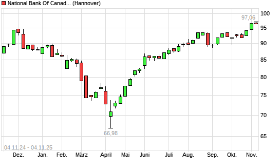Mit dem Anstieg auf 96,72 EUR hat die National Bank Of Canada-Aktie (ISIN CA6330671034) am 03.11.2025 ein neues All-Time-High erreicht und damit den Kurs vom 29.10.2025 eingestellt.Die National ...weiterlesen
