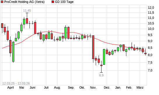 Mit dem Anstieg auf 8,20 EUR hat die ProCredit Holding-Aktie am 11.03.2026 die 100-Tage-Linie nach oben gekreuzt.Die ProCredit Holding-Aktie befindet sich seit dem 21.10.2025 ...weiterlesen