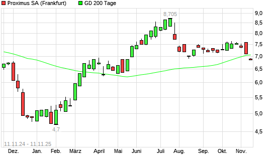 Mit dem Rücksetzer auf 6,91 EUR hat die Proximus-Aktie am 10.11.2025 die 200-Tage-Linie nach unten gekreuzt.Die Proximus-Aktie befand sich seit dem 10.04.2025 im langfristigen Abwärtstrend ...weiterlesen