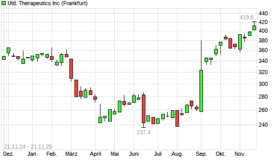 Mit dem Anstieg auf 412,80 EUR hat die United Therapeutics-Aktie (ISIN US91307C1027) am 20.11.2025 ein neues All-Time-High erreicht und damit den Kurs vom 19.11.2025 eingestellt.Die United Therapeutics-Aktie ...weiterlesen