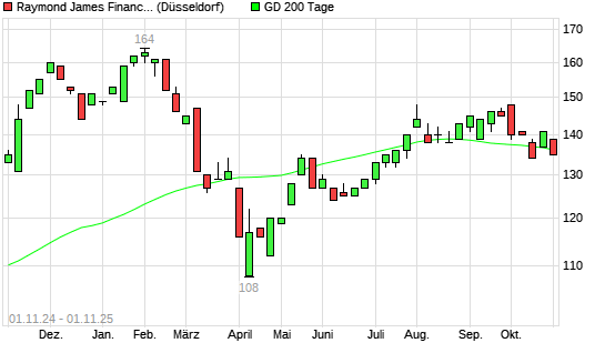 Mit dem Rücksetzer auf 136,00 EUR hat die Raymond James Financial-Aktie am 31.10.2025 die 200-Tage-Linie nach unten gekreuzt.Die Raymond James Financial-Aktie befand sich seit dem 30.10.2025 ...weiterlesen
