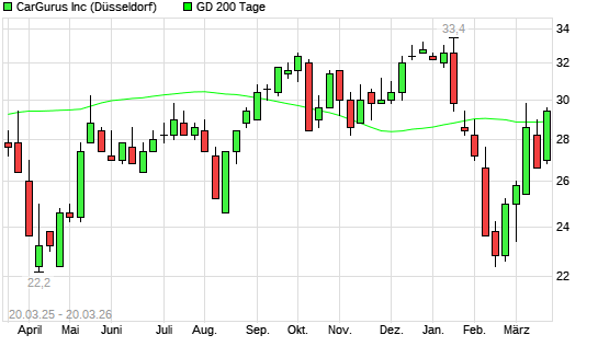 Mit dem Anstieg auf 29,40 EUR hat die CarGurus,-Aktie am 19.03.2026 die 200-Tage-Linie nach oben gekreuzt.Die CarGurus,-Aktie befand sich seit dem 11.03.2026 im langfristigen ...weiterlesen