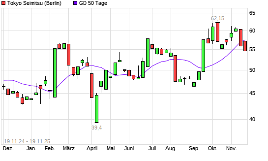 Mit dem Rücksetzer auf 56,55 EUR hat die Tokyo Seimitsu-Aktie am 18.11.2025 die 50-Tage-Linie nach unten gekreuzt.Die Tokyo Seimitsu-Aktie befindet sich seit dem 12.09.2025 im langfristigen ...weiterlesen