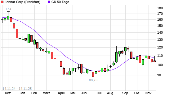 Mit dem Rücksetzer auf 106,32 EUR hat die Lennar-Aktie am 13.11.2025 die 50-Tage-Linie nach unten gekreuzt.Die Lennar-Aktie befindet sich seit dem 10.11.2025 im langfristigen Aufwärtstrend ...weiterlesen