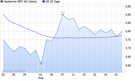 Mit dem Rücksetzer auf 5,76 EUR hat die Hamborner REIT-Aktie am 22.08.2025 die 20-Tage-Linie nach unten gekreuzt.Die Hamborner REIT-Aktie befindet sich seit dem 27.06.2025 im langfristigen ...weiterlesen