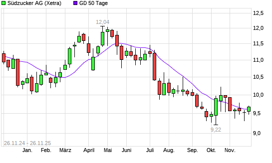 Mit dem Anstieg auf 9,69 EUR hat die Südzucker-Aktie am 25.11.2025 die 50-Tage-Linie nach oben gekreuzt.Die Südzucker-Aktie befindet sich seit dem 10.07.2025 im langfristigen Abwärtstrend ...weiterlesen