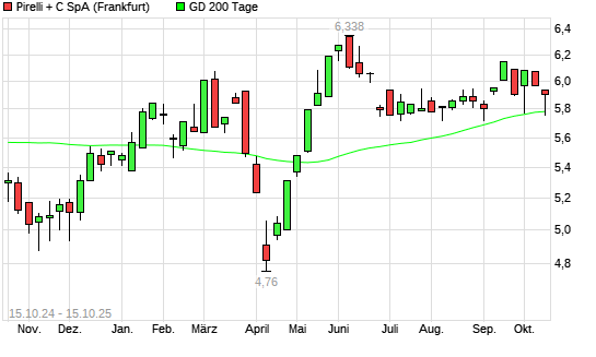 Mit dem Rücksetzer auf 5,76 EUR hat die Pirelli-Aktie am 14.10.2025 die 200-Tage-Linie nach unten gekreuzt.Die Pirelli-Aktie befand sich seit dem 02.05.2025 im langfristigen Abwärtstrend ...weiterlesen